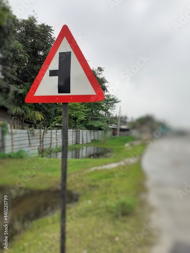 Three way junction warning sign board, intersection traffic sign on the roadside