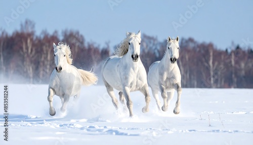 Three white horses gallop across a snowy field under a bright blue sky, forest visible in the background
