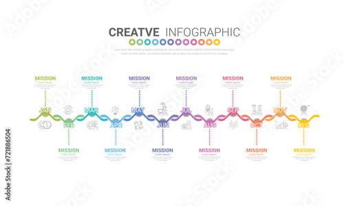 Timeline for 1 year, 12 months, infographics all month planner design and Presentation business can be used for workflow, process diagram, flow chart.