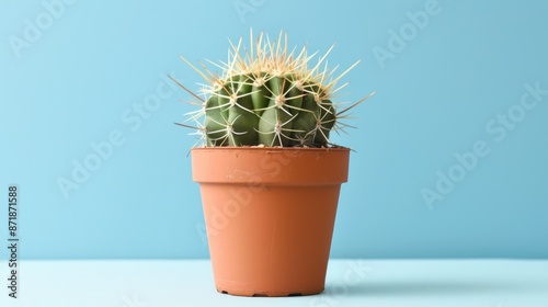 Tiny homegrown spiky cactus in a brown pot on a white and blue backdrop