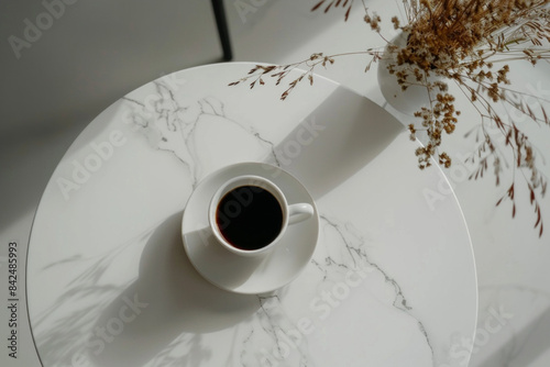 Top down view of a coffee cup placed on a simple, elegant table with minimal decor