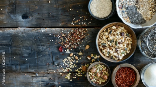 Top view, flat lay yummy millet and quinoa granola and fresh seeds placed on lumber table in kitchen