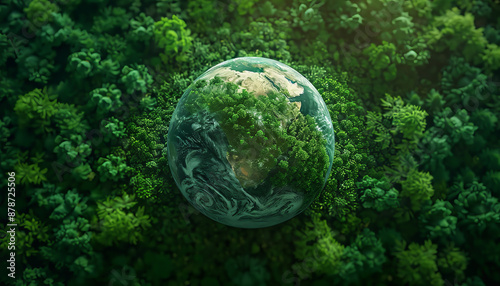 Top view global globe, tropical rain forest ecosystem and healthy environment, green forest forest texture and background,generative ai