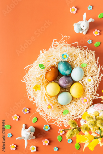 Top view of nest with natural dyes dyed Easter eggs, bouquet with yellow daffodils in vase and Easter bunnies on orange background