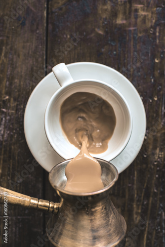 top view of pouring hot coffee from cezve into cup on wooden tabletop