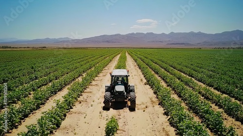 Tractor Drives Through Rows Of Green Crops In A Vast Field