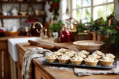 Traditional family kitchen table with trays of mince pies and decorations