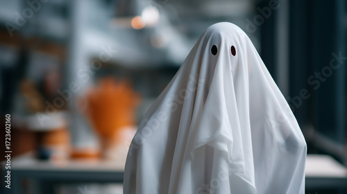 Traditional white sheet ghost costume simple holes eyes mouth floating appearance isolated white background easy Halloween costume DIY ghost decoration ideas blurred background
