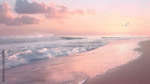 Tranquil Beach Sunrise with Soft Waves and Seagull