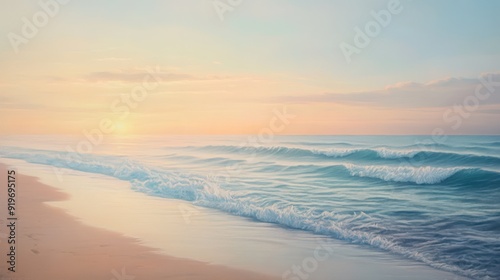 Tranquil Beach Sunset with Gentle Waves and Soft Pink Sky.