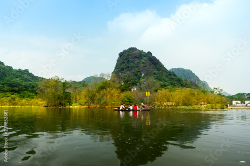 Travel by boat in flooded areas submerged trees in YEN stream, Myduc, Hanoi, Vietnam.