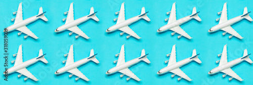 Travel minimal background banner. Model airplane in flight on an empty colored background. Copy space