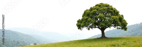 Tree on isolated white background with forest details in the distance, landscape, nature, still life