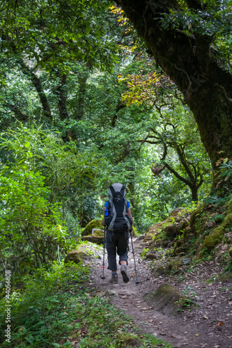 Trekker in forest on Manaslu circuit trek in Himalayas