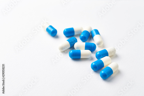 Tri-Creatine Malate capsules. Bodybuilding food supplements on white paper background. Close up. Copy space.