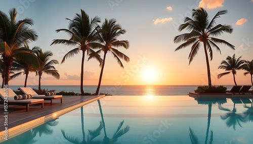 Tropical resort infinity pool at sunset, with palm trees and lounge chairs.