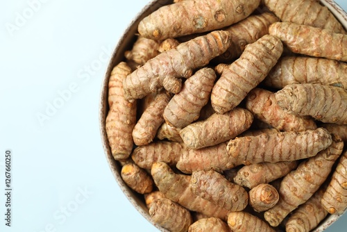 Tumeric rhizomes in bowl on light blue background, top view