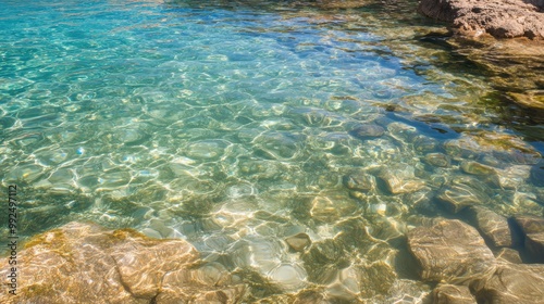 Turquoise water shimmers under sunlight, revealing rocks underneath, creating a tranquil and picturesque coastal atmosphere