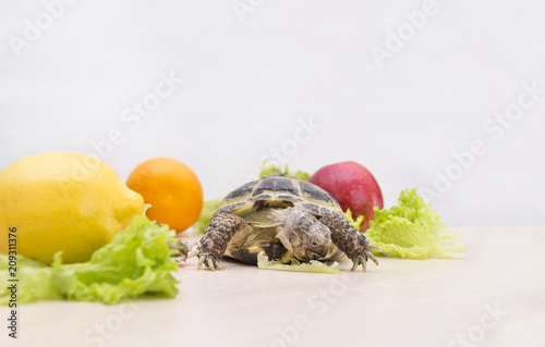 turtle eats green lettuce, reptile, greens, turtle shell, feeding, food, fruit