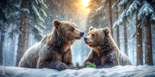 Two Brown Bears in a Snowy Winter Landscape, Natural Habitat, Wildlife Photography, Snowy Forest, Animal Behavior, Cold Weather, Nature Exploration, Winter Animals, Scenic View, Bear Interaction