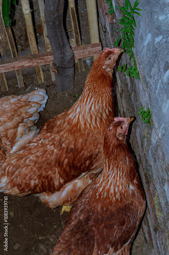 Two brown chickens are pecking at green leaves growing on a brick wall in an enclosed area with a wooden fence.