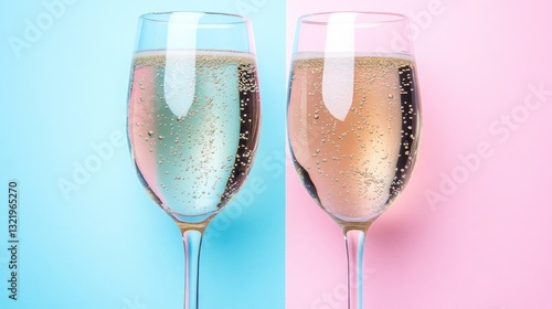 Two champagne flutes, filled with bubbly wine, on a two-toned background