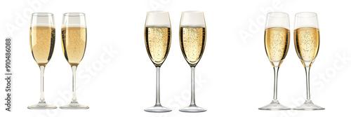 Two champagne glasses staying beside with champagne with sparkle on transparent background