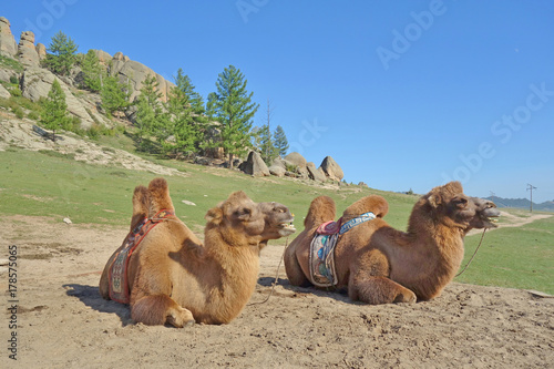 Two dromedary camels in the Gorkhi-Terelj National Park in Mongolia