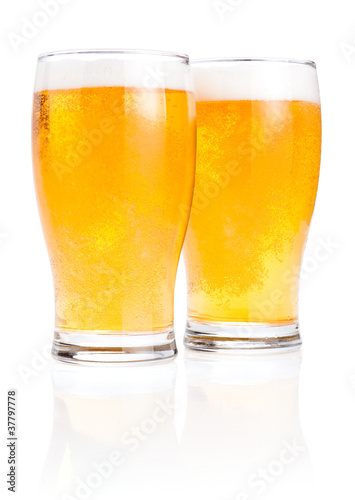 Two glasses fresh lager beer with foam Isolated on white backgro