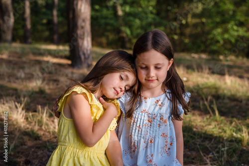 Two little girlfriends girls hugging in the forest, friendship concept, summer time