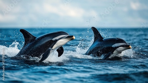 Two playful dolphins leaping out of the ocean, creating beautiful splashes and showcasing their sleek, black and white bodies against the vast blue waters.