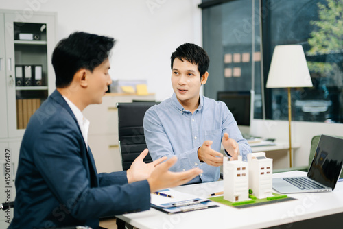 Two professional men analyzing house model and design layout in office. Ideal for themes of architecture, investment, real estate, property