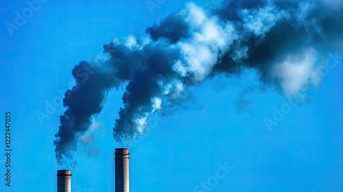 Two tall smokestacks emit dark smoke against a clear blue sky, highlighting industrial pollution and environmental concerns.