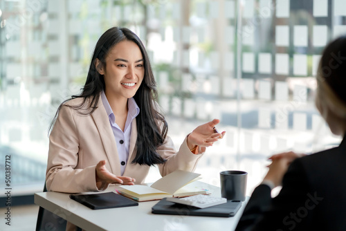 Two young Asian business woman talk, consult, discuss working with new startup project idea presentation analyze plan marketing and investment in the office.