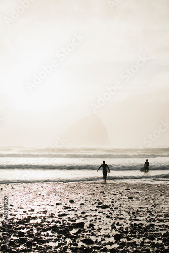 Two young surfers paddling out to catch waves is Coastal Oregon