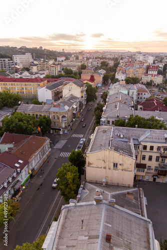Ukraine, Kyiv – July 04, 2015: Aerial panoramic view on central and historical part, area of city Podil with residential buildings in the evening, during the sunset. Pre-revolutionary buildings