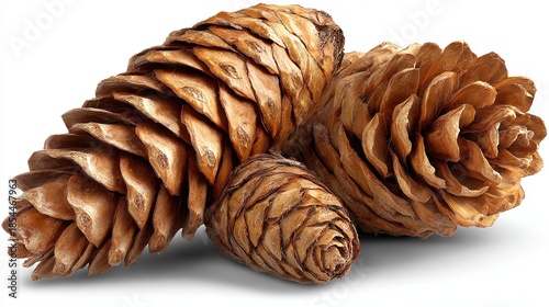Ultra-sharp shadow-free flat close-up trio pine-cones on white, high contrast copy space, ideal for premium aroma box, brand site hero, holiday limited page