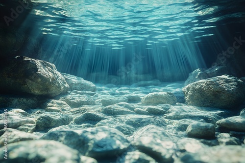 Underwater landscape of sunny sea with stones and rocks on sandy bottom