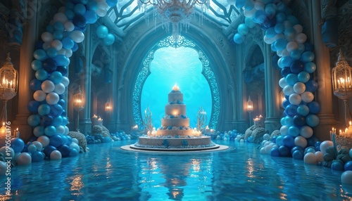Underwater palace ballroom features birthday party decor with blue, white balloons. Grand tiered cake sits on platform surrounded by water. Candles, ornate architecture enhance festive ocean