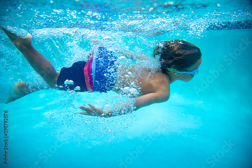 Underwater photo of a Young Boy in the Swimming Pool with Goggles. Summer Vacation Fun action photo.