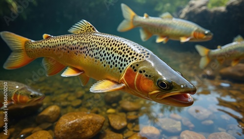 Underwater shot of brown trout swimming in clear freshwater. Fish showcases detailed scales, natural habitat. Wildlife, aquatic life, riverbed scenes. Vibrant colors, detailed scales, true nature art.
