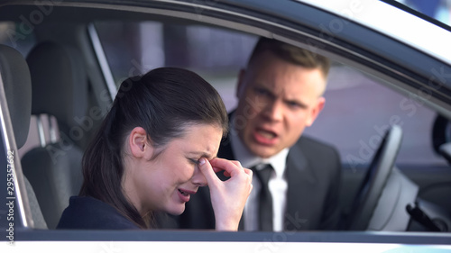 Unhappy woman crying after quarrel with boyfriend in car, relationship crisis