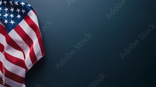 United States flag on dark navy; flat lay view Use patriotic palette