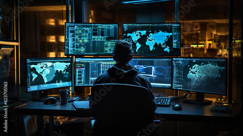 Unrecognizable man sitting against computer monitors in dark room of hacker base.