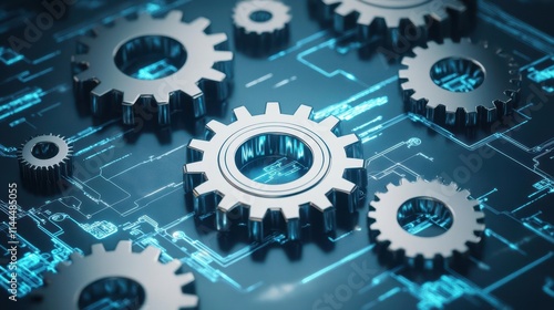 Update process visualized as gears meshing with flowing data streams, metallic textures, 3D render, deep blue and silver palette