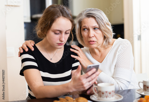 Upset mature mother with adult daughter using smartphone in kitchen interior