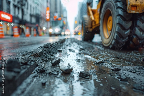 Urban construction site with heavy machinery and rough terrain on a wet, rainy day, showcasing urban development and infrastructure improvements.