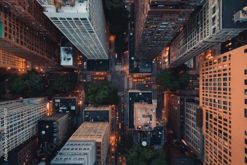 Urban landscape at dusk showcasing city streets and illuminated buildings from an aerial view in New York
