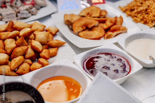 Uzbek flour treats with jam. fried baursaks on the Uzbek holiday Nauryz