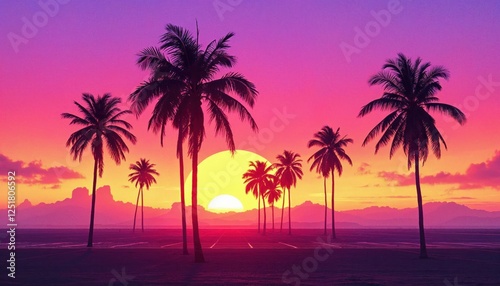 Vaporwave Dream: Palm Trees Silhouetted Against a Retro Sunset Skyline